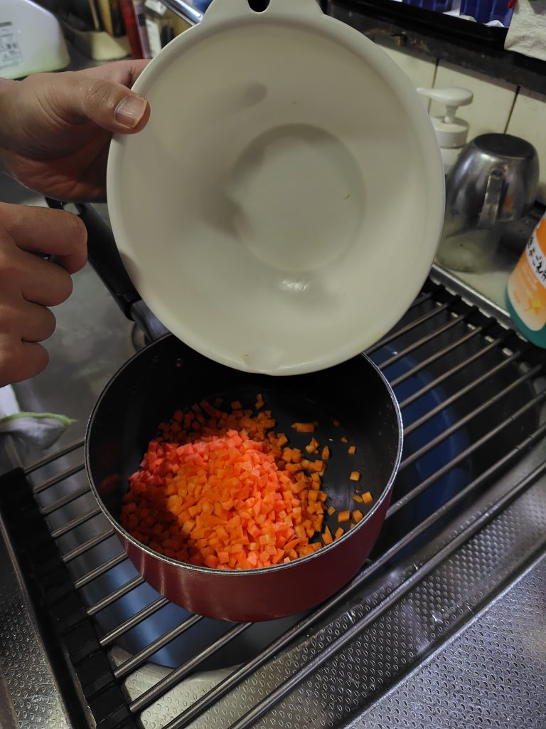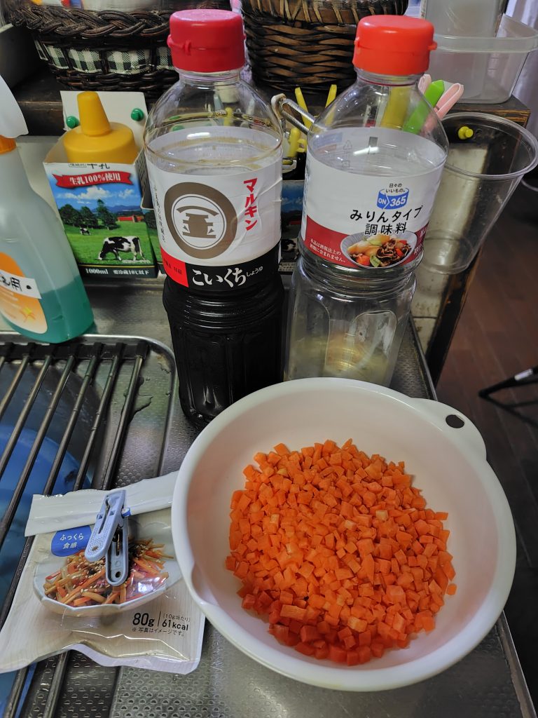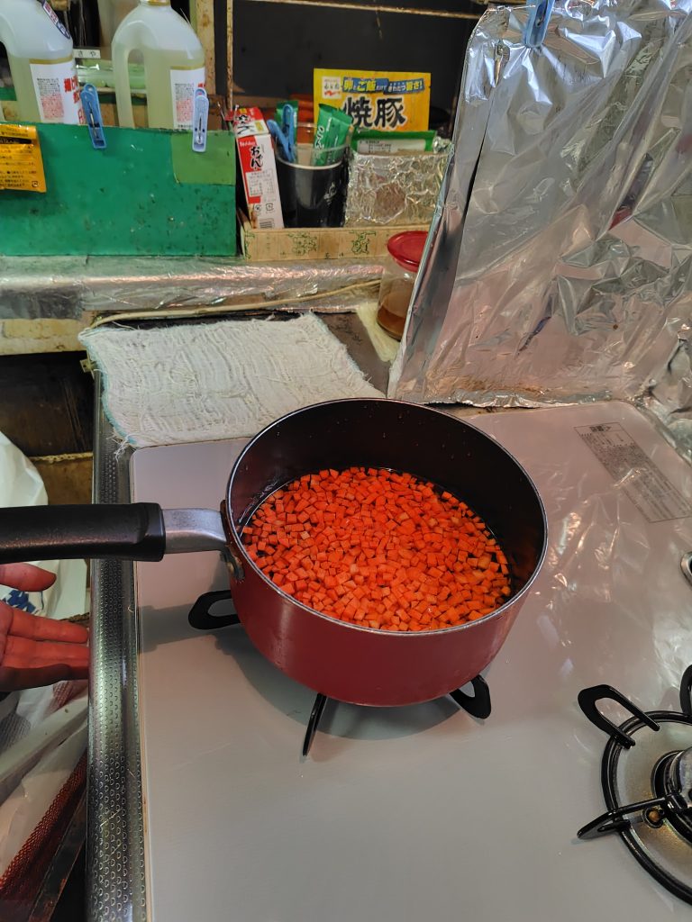 にんじんは皮をむいてヘタを切り取ってから乱切りに切る。