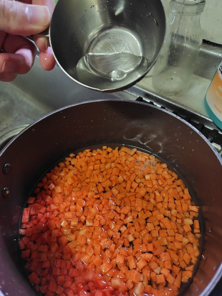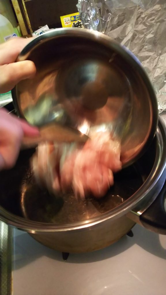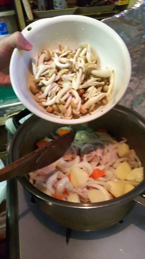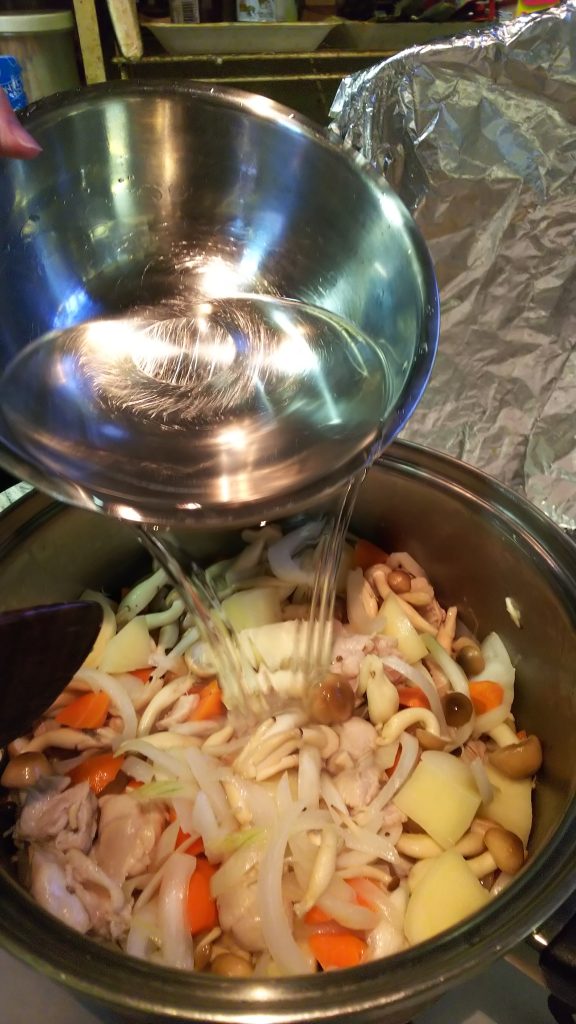 水を加えてアクを取り、具材が柔らかくなるまで15分煮込む。