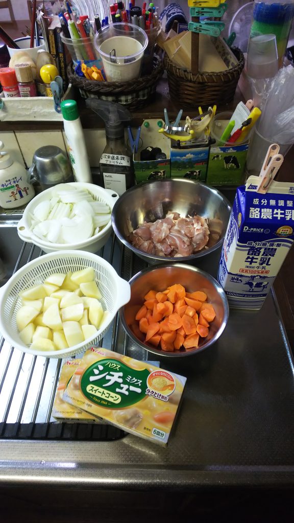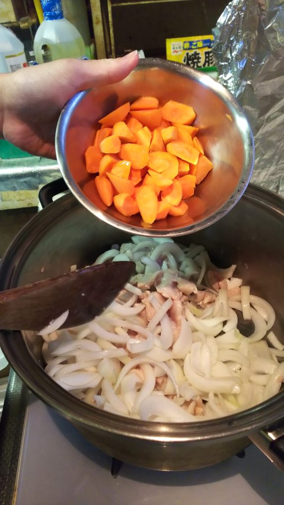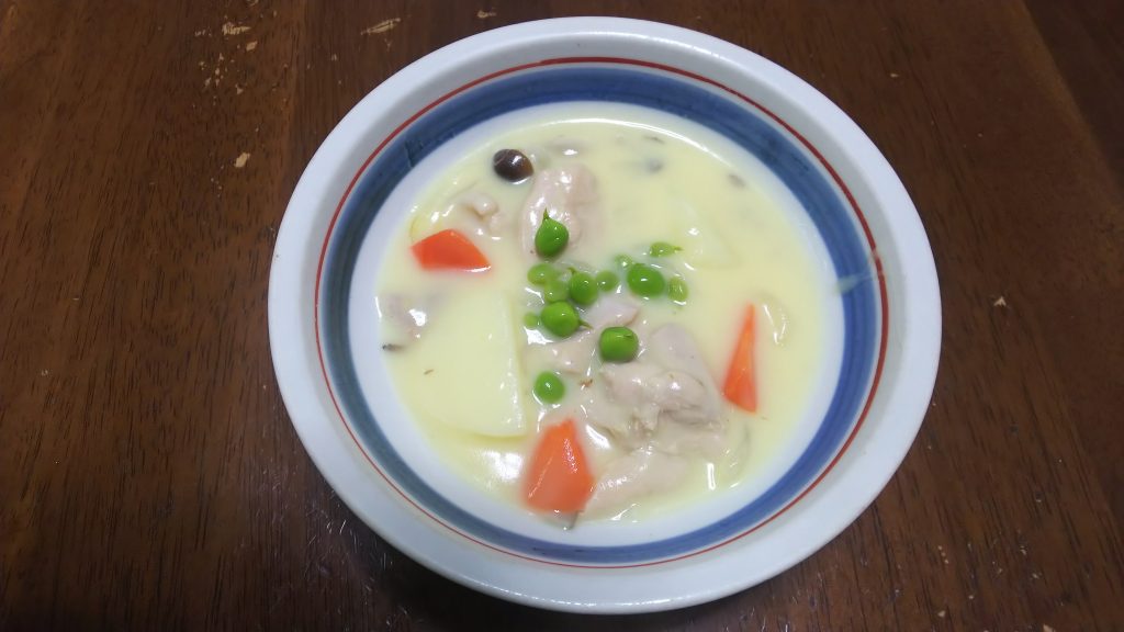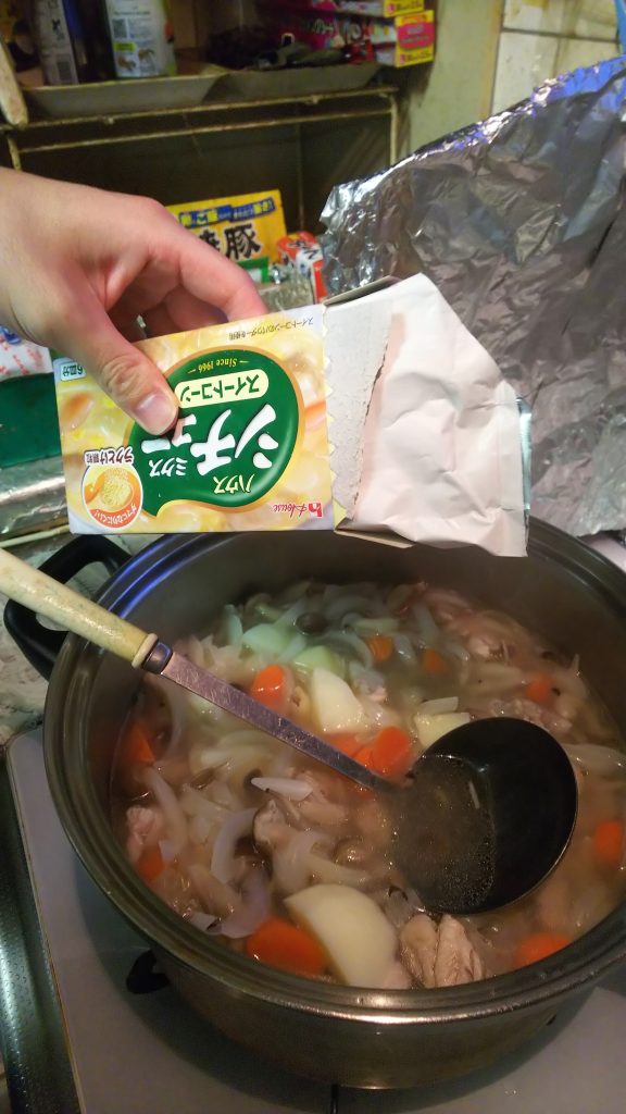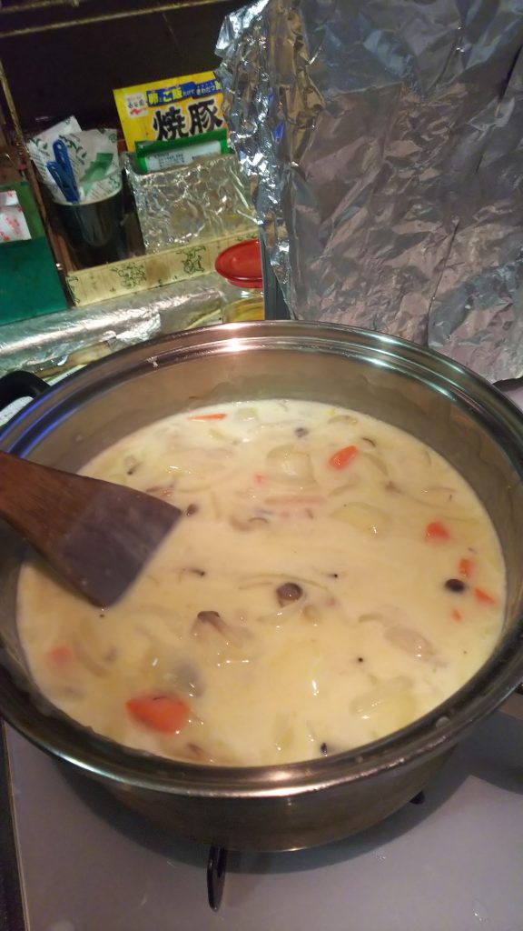 火を止めてからクリームシチューのルゥを振り入れて溶かす。