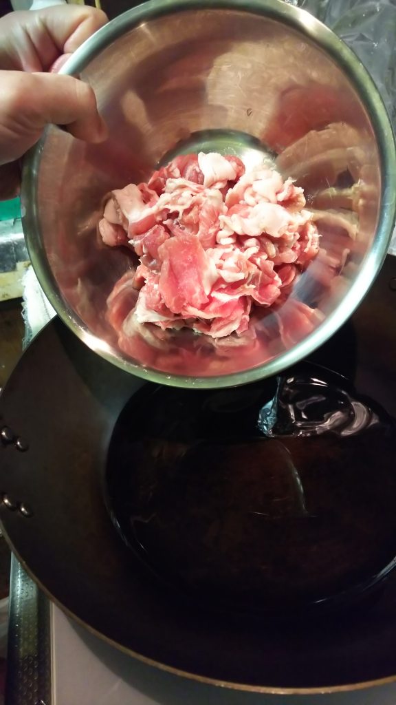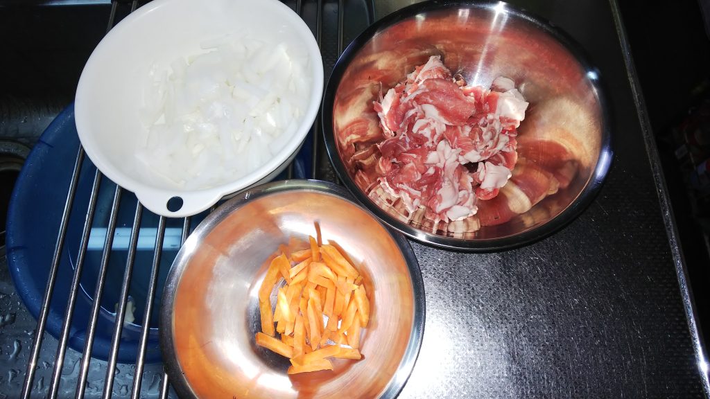 玉ネギは皮をむき芯を切り取ってから2cm幅に切る。