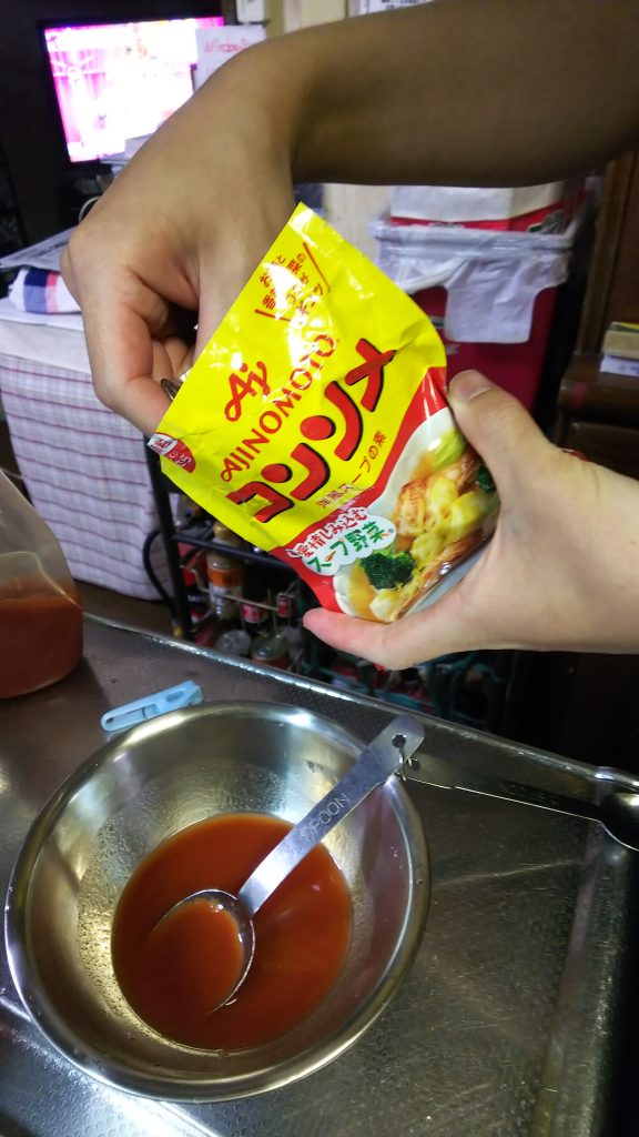 火を止めてからクリームシチューのルゥを振り入れて溶かす。