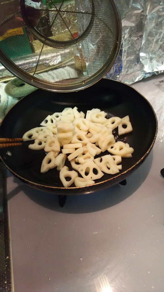 レンコン(水煮)をいちょう切りに切ってから下茹でをする。そのあとザルに上げる。
